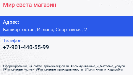 Мир света, магазин по адресу Башкортостан, Иглино, Спортивная, 2 в дальнейшем Организация, размещена в следующих категориях: