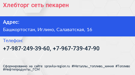 Хлебторг, сеть пекарен по адресу Башкортостан, Иглино, Салаватская, 16 в дальнейшем Организация, размещена в следующих категориях:
