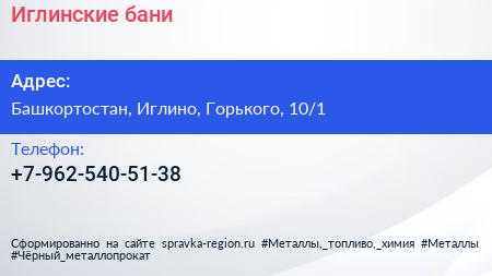 Иглинские бани по адресу Башкортостан, Иглино, Горького, 10/1 в дальнейшем Организация, размещена в следующих категориях: