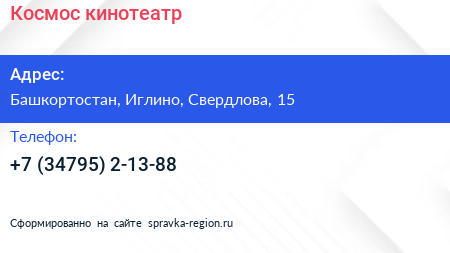 Космос, кинотеатр по адресу Башкортостан, Иглино, Свердлова, 15 в дальнейшем Организация, размещена в следующих категориях: