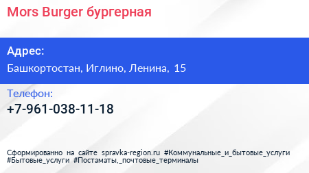 Mors & Burger, бургерная по адресу Башкортостан, Иглино, Ленина, 15 в дальнейшем Организация, размещена в следующих категориях: