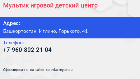 Мультик, игровой детский центр по адресу Башкортостан, Иглино, Горького, 41 в дальнейшем Организация, размещена в следующих категориях: