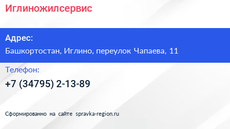 Иглиножилсервис по адресу Башкортостан, Иглино, переулок Чапаева, 11 в дальнейшем Организация, размещена в следующих категориях: