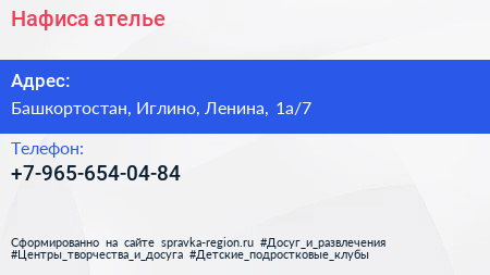 Нафиса, ателье по адресу Башкортостан, Иглино, Ленина, 1а/7 в дальнейшем Организация, размещена в следующих категориях: