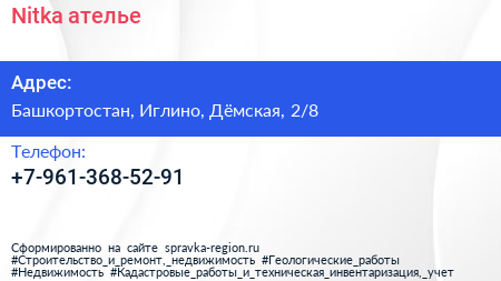 Nitka, ателье по адресу Башкортостан, Иглино, Дёмская, 2/8 в дальнейшем Организация, размещена в следующих категориях: