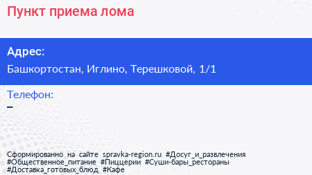 Пункт приема лома по адресу Башкортостан, Иглино, Терешковой, 1/1 в дальнейшем Организация, размещена в следующих категориях: