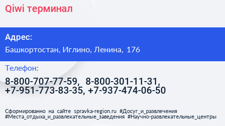 Qiwi, терминал по адресу Башкортостан, Иглино, Ленина, 176 в дальнейшем Организация, размещена в следующих категориях: