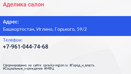 Аделика, салон по адресу Башкортостан, Иглино, Горького, 59/2 в дальнейшем Организация, размещена в следующих категориях: