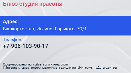 Блюз, студия красоты по адресу Башкортостан, Иглино, Горького, 70/1 в дальнейшем Организация, размещена в следующих категориях: