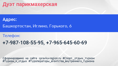 Дуэт, парикмахерская по адресу Башкортостан, Иглино, Горького, 6 в дальнейшем Организация, размещена в следующих категориях: