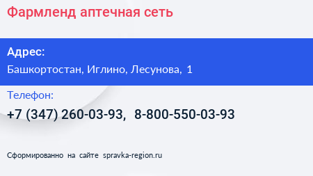 Фармленд, аптечная сеть по адресу Башкортостан, Иглино, Лесунова, 1 в дальнейшем Организация, размещена в следующих категориях: