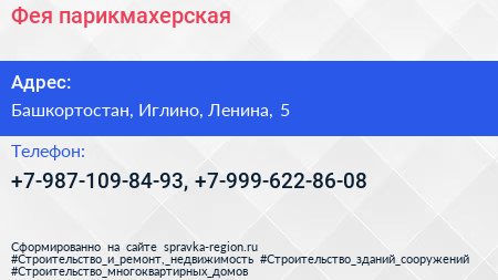 Фея, парикмахерская по адресу Башкортостан, Иглино, Ленина, 5 в дальнейшем Организация, размещена в следующих категориях:
