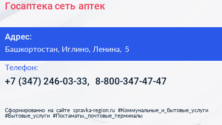 Госаптека, сеть аптек по адресу Башкортостан, Иглино, Ленина, 5 в дальнейшем Организация, размещена в следующих категориях: