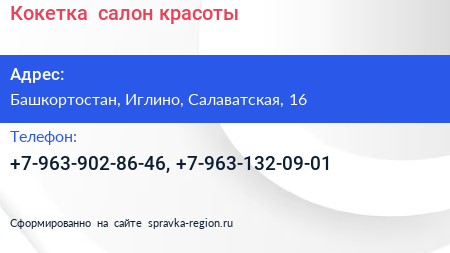 Кокетка+, салон красоты по адресу Башкортостан, Иглино, Салаватская, 16 в дальнейшем Организация, размещена в следующих категориях: