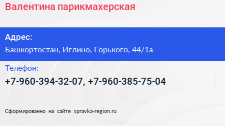 Валентина, парикмахерская по адресу Башкортостан, Иглино, Горького, 44/1а в дальнейшем Организация, размещена в следующих категориях: