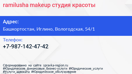 ramilusha makeup, студия красоты по адресу Башкортостан, Иглино, Вологодская, 54/1 в дальнейшем Организация, размещена в следующих категориях: