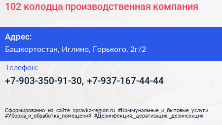102 колодца, производственная компания по адресу Башкортостан, Иглино, Горького, 2г/2 в дальнейшем Организация, размещена в следующих категориях: