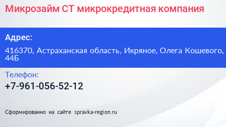 Микрозайм-СТ, микрокредитная компания по адресу 416370, Астраханская область, Икряное, Олега Кошевого, 44Б в дальнейшем Организация, размещена в следующих категориях: