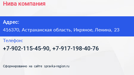 Нива, компания по адресу 416370, Астраханская область, Икряное, Ленина, 23 в дальнейшем Организация, размещена в следующих категориях: