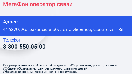 МегаФон, оператор связи по адресу 416370, Астраханская область, Икряное, Советская, 36 в дальнейшем Организация, размещена в следующих категориях: