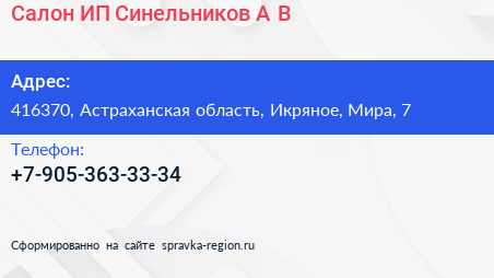 Салон, ИП Синельников А.В. по адресу 416370, Астраханская область, Икряное, Мира, 7 в дальнейшем Организация, размещена в следующих категориях: