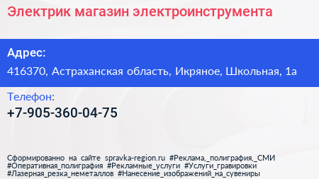 Электрик, магазин электроинструмента по адресу 416370, Астраханская область, Икряное, Школьная, 1а в дальнейшем Организация, размещена в следующих категориях:
