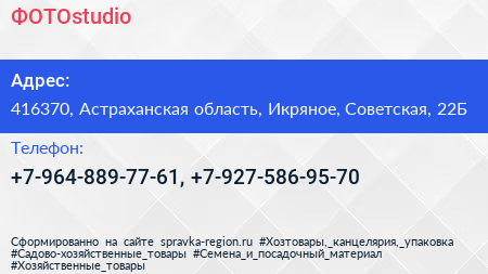 ФОТОstudio по адресу 416370, Астраханская область, Икряное, Советская, 22Б в дальнейшем Организация, размещена в следующих категориях: