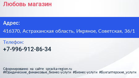 Любовь, магазин по адресу 416370, Астраханская область, Икряное, Советская, 36/1 в дальнейшем Организация, размещена в следующих категориях: