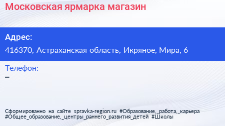 Московская ярмарка, магазин по адресу 416370, Астраханская область, Икряное, Мира, 6 в дальнейшем Организация, размещена в следующих категориях: