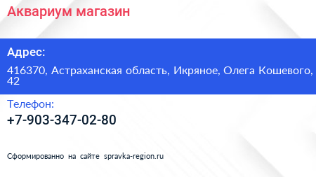Аквариум, магазин по адресу 416370, Астраханская область, Икряное, Олега Кошевого, 42 в дальнейшем Организация, размещена в следующих категориях: