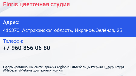 Floris, цветочная студия по адресу 416370, Астраханская область, Икряное, Зелёная, 2Б в дальнейшем Организация, размещена в следующих категориях: