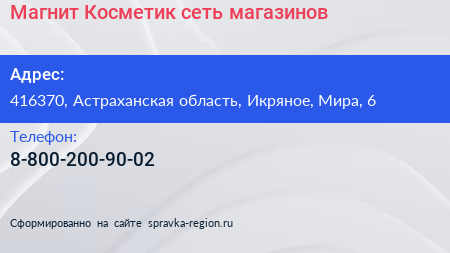 Магнит Косметик, сеть магазинов по адресу 416370, Астраханская область, Икряное, Мира, 6 в дальнейшем Организация, размещена в следующих категориях: