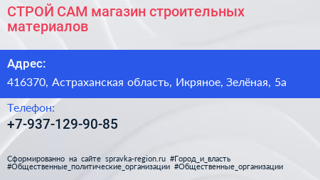 СТРОЙ САМ, магазин строительных материалов по адресу 416370, Астраханская область, Икряное, Зелёная, 5а в дальнейшем Организация, размещена в следующих категориях: