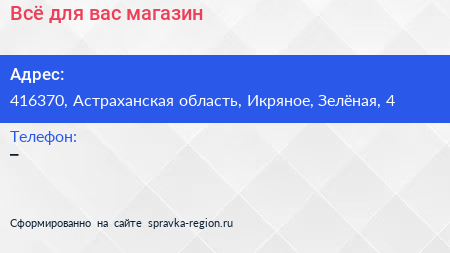 Всё для вас, магазин по адресу 416370, Астраханская область, Икряное, Зелёная, 4 в дальнейшем Организация, размещена в следующих категориях: