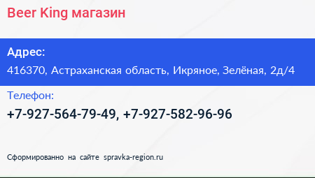 Beer King, магазин по адресу 416370, Астраханская область, Икряное, Зелёная, 2д/4 в дальнейшем Организация, размещена в следующих категориях:
