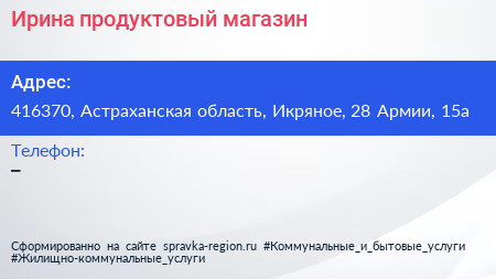 Ирина, продуктовый магазин по адресу 416370, Астраханская область, Икряное, 28 Армии, 15а в дальнейшем Организация, размещена в следующих категориях: