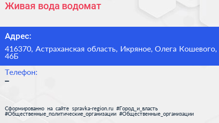 Живая вода, водомат по адресу 416370, Астраханская область, Икряное, Олега Кошевого, 46Б в дальнейшем Организация, размещена в следующих категориях: