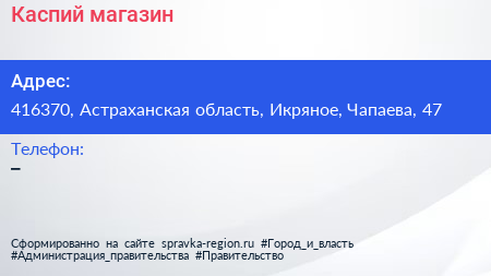 Каспий, магазин по адресу 416370, Астраханская область, Икряное, Чапаева, 47 в дальнейшем Организация, размещена в следующих категориях: