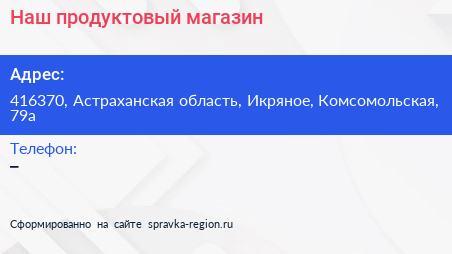 Наш, продуктовый магазин по адресу 416370, Астраханская область, Икряное, Комсомольская, 79а в дальнейшем Организация, размещена в следующих категориях: