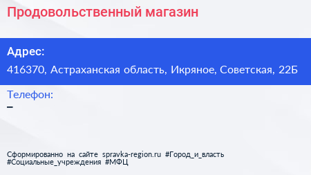 Продовольственный магазин по адресу 416370, Астраханская область, Икряное, Советская, 22Б в дальнейшем Организация, размещена в следующих категориях: