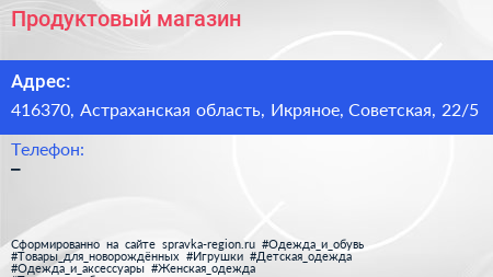 Продуктовый магазин по адресу 416370, Астраханская область, Икряное, Советская, 22/5 в дальнейшем Организация, размещена в следующих категориях: