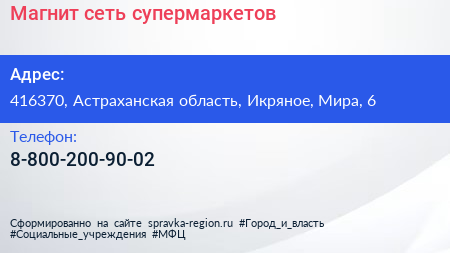 Магнит, сеть супермаркетов по адресу 416370, Астраханская область, Икряное, Мира, 6 в дальнейшем Организация, размещена в следующих категориях: