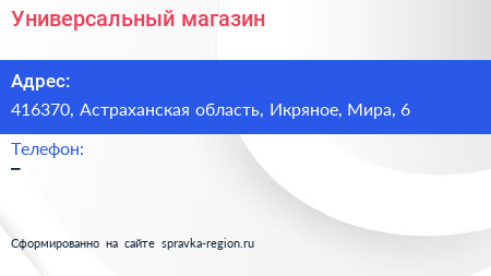 Универсальный магазин по адресу 416370, Астраханская область, Икряное, Мира, 6 в дальнейшем Организация, размещена в следующих категориях: