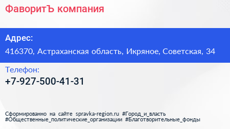 ФаворитЪ, компания по адресу 416370, Астраханская область, Икряное, Советская, 34 в дальнейшем Организация, размещена в следующих категориях: