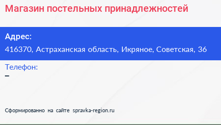 Магазин постельных принадлежностей по адресу 416370, Астраханская область, Икряное, Советская, 36 в дальнейшем Организация, размещена в следующих категориях: