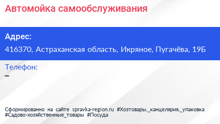 Автомойка самообслуживания по адресу 416370, Астраханская область, Икряное, Пугачёва, 19Б в дальнейшем Организация, размещена в следующих категориях: