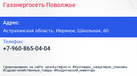 Газэнергосеть Поволжье по адресу Астраханская область, Икряное, Школьная, 60 в дальнейшем Организация, размещена в следующих категориях: