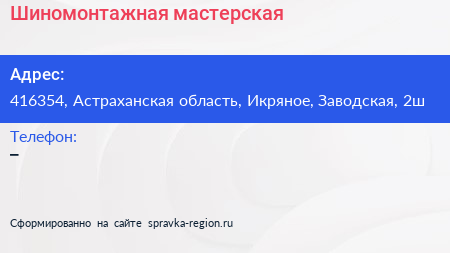 Шиномонтажная мастерская по адресу 416354, Астраханская область, Икряное, Заводская, 2ш в дальнейшем Организация, размещена в следующих категориях: