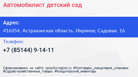 Автомобилист, детский сад по адресу 416354, Астраханская область, Икряное, Садовая, 16 в дальнейшем Организация, размещена в следующих категориях: