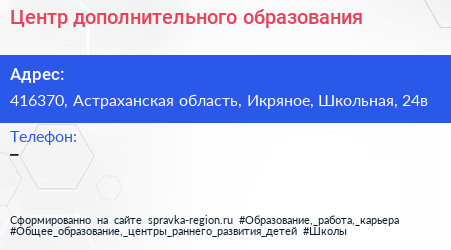 Центр дополнительного образования по адресу 416370, Астраханская область, Икряное, Школьная, 24в в дальнейшем Организация, размещена в следующих категориях: